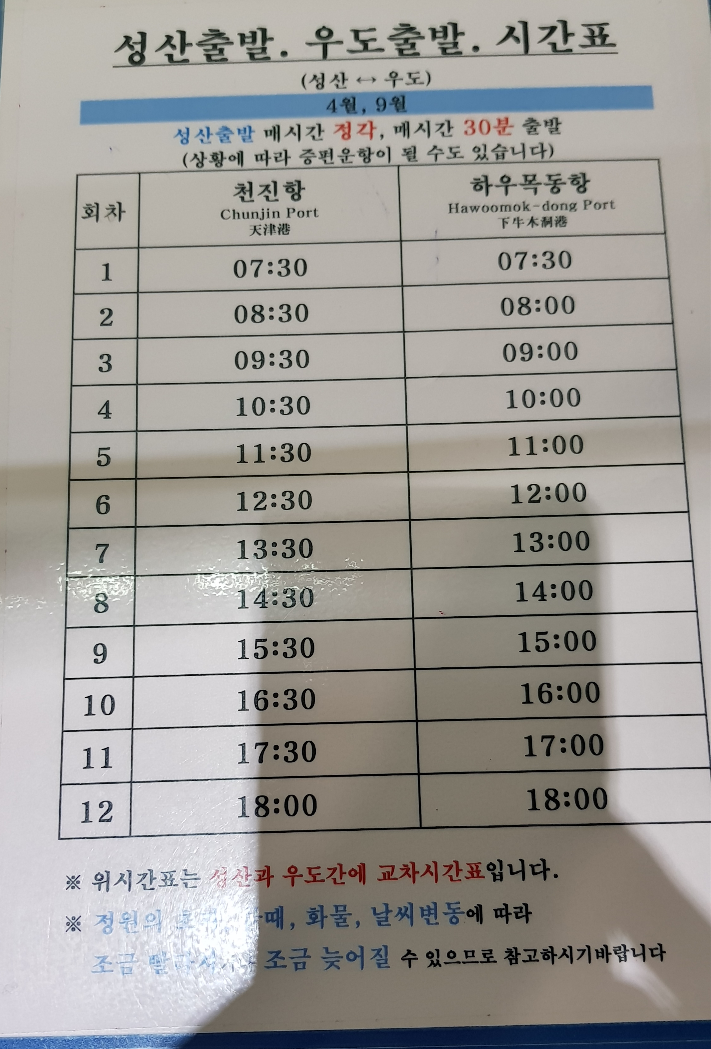 - 천진항에서 성산항으로 출발하는 배시간표입니다.